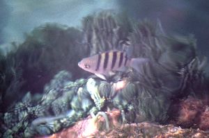 The fact that the fish turned over onto its side when it swam by makes the picture look like it came from the bottom of the bay. But it didn't! I think the fish is called a sergeant major.